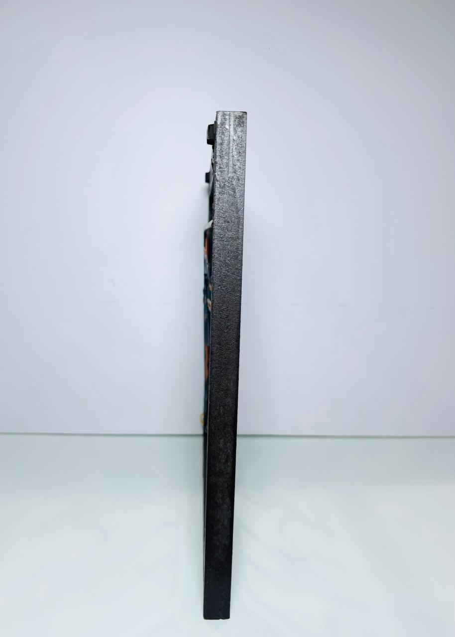 Bring a slice of India’s rich tribal heritage into your living room with this vibrant, handcrafted metal wall hanging. Two tribal figures—one carrying a plough, the other walking alongside—are beautifully sculpted and painted, framed within a sleek square border. The bold colors pop against the matte black bodies, and the copper‑tone accents add a warm, artisanal glow that works equally well in modern or ethnic interiors.